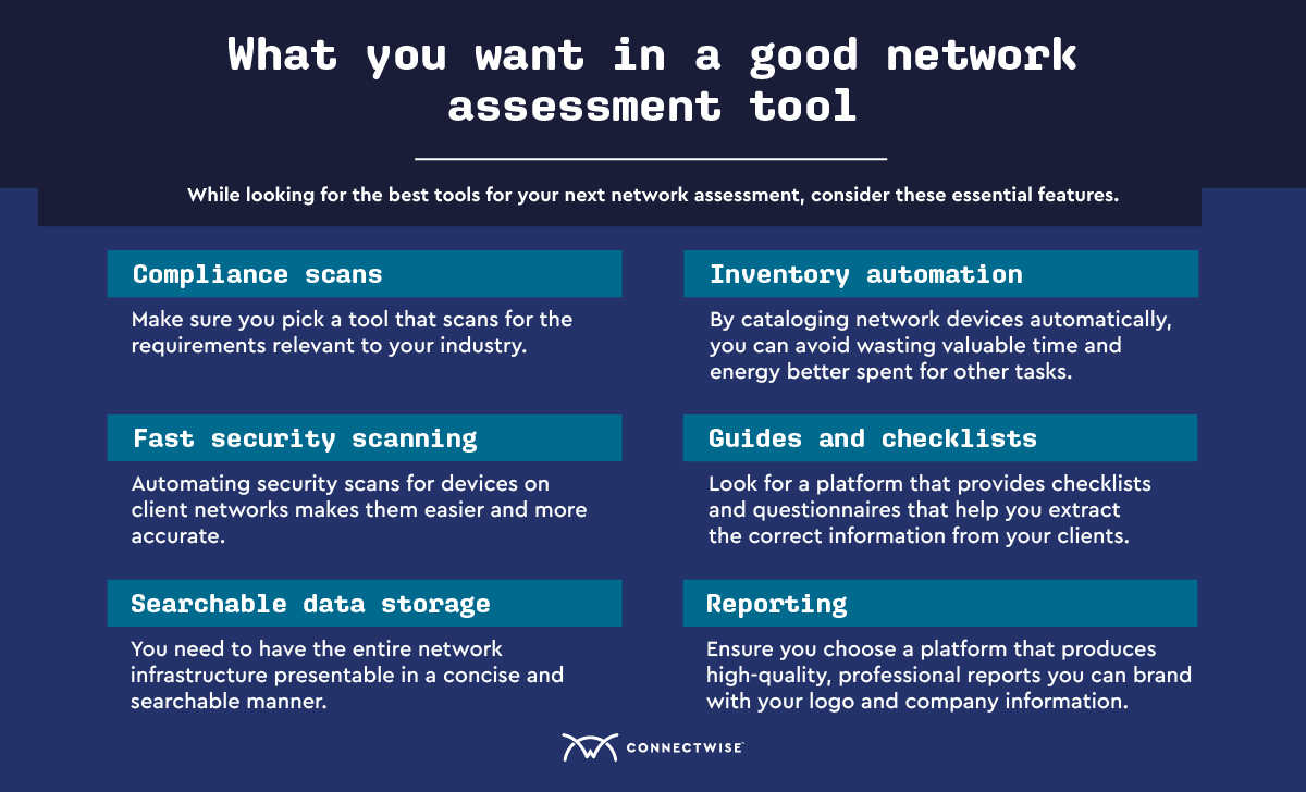 The amount of network assessment tools available today can be overwhelming. It’s easy to make the wrong choice and be left with something that doesn’t serve your clients. To avoid making that type of purchase, here are the features you should be searching for when you’re shopping: