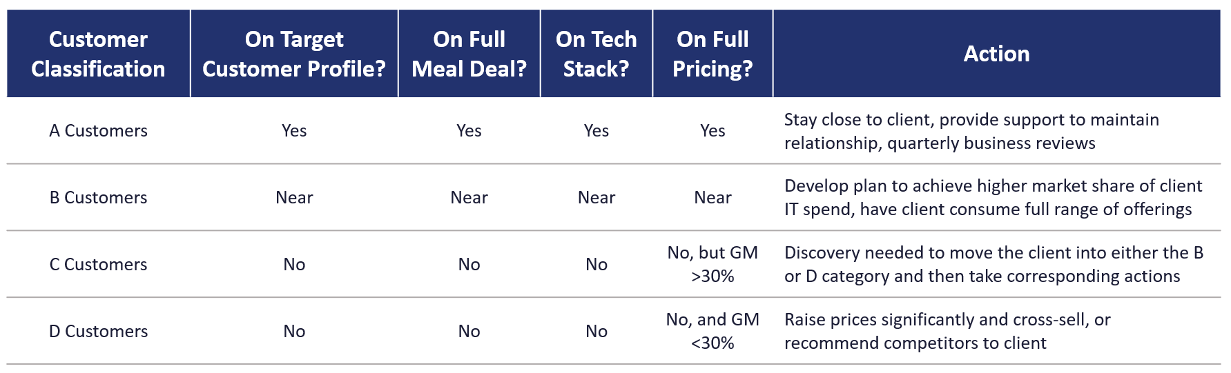 • D customers: Delivering less than 30% services gross margin. This is the breaking point. For any customer below 30% you’re losing money. They are difficult to support, and you are not making money. Moving them up will make them easier to work with.