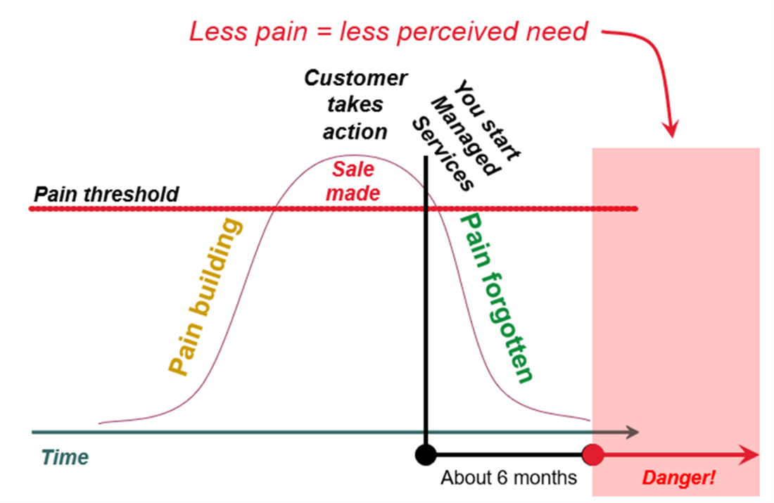 QBRs follow the arc of the customer relationship lifecycle. During the pre-sales phase, you’re learning about the customer and understanding their needs, also known as pain building. At some point, the pain threshold reaches a point where they’re ready to make a decision and you make a sale.